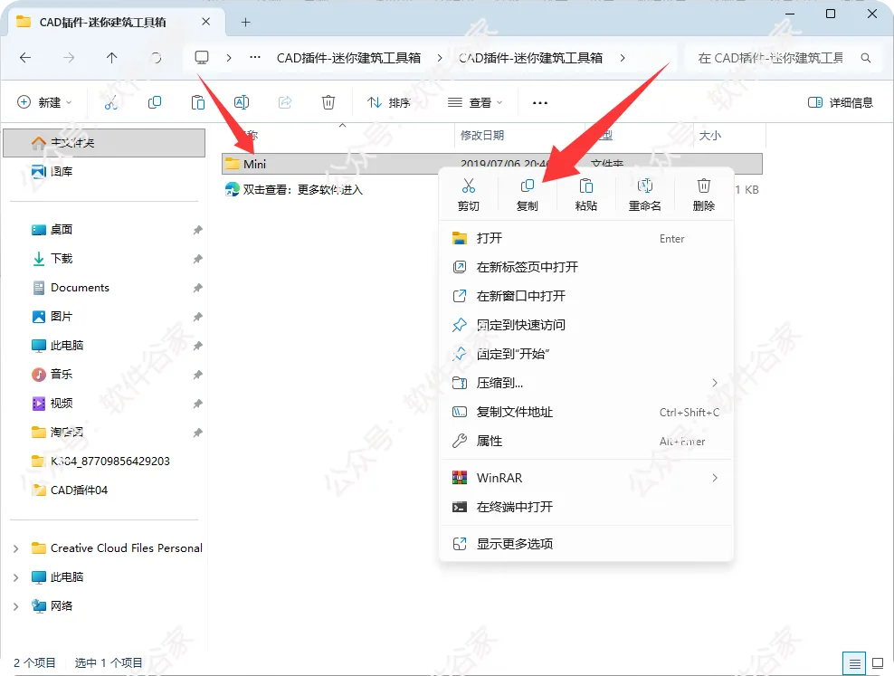 关闭所有AutoCAD进程→复制解压后的“Mini”整个文件夹。