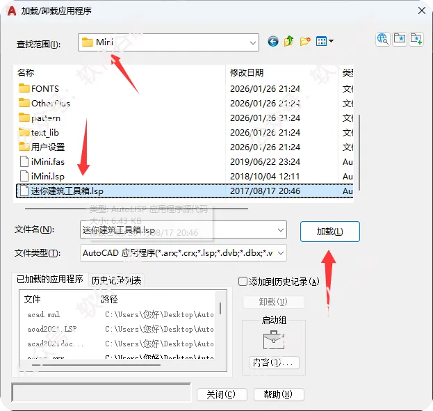 启动AutoCAD→将“Mini\迷你建筑工具箱.lsp”拖拽到绘图区或者输入ap打开→弹窗点“始终加载”。