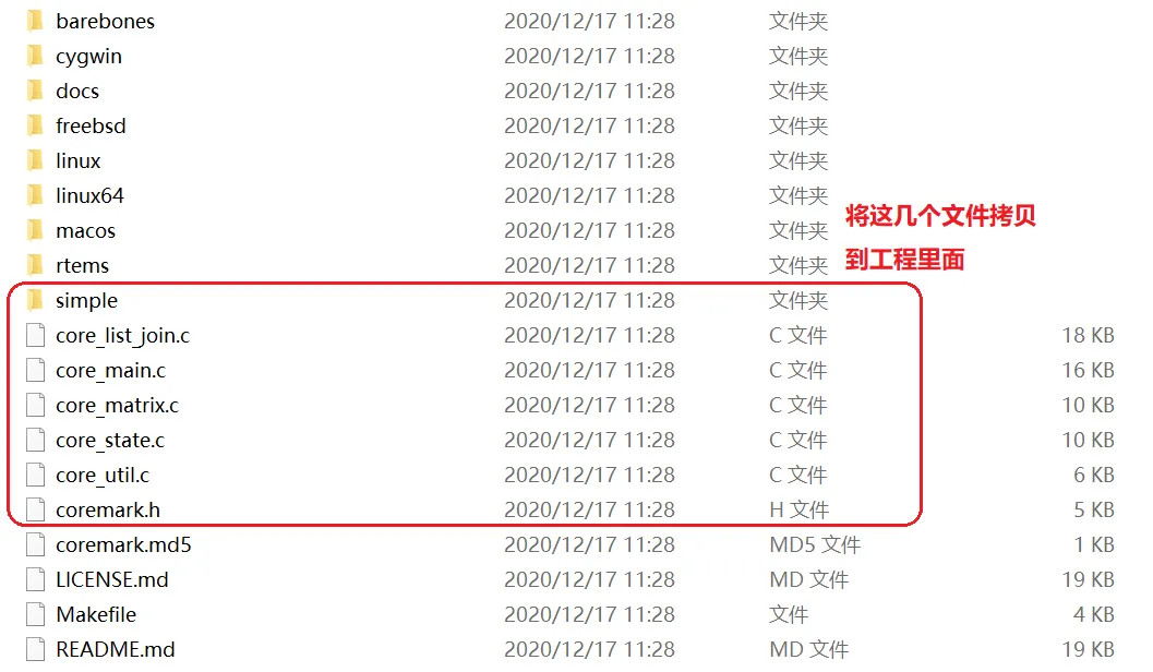 CoreMark的测试代码文件包括:
