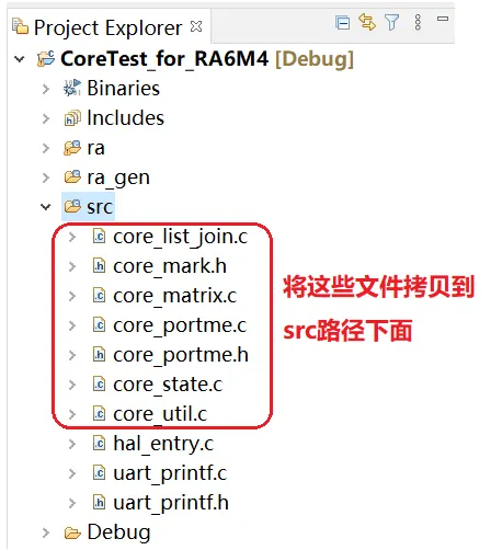 本人是用RA6M4开发板调试,新建一个工程,并选好所使用的的MCU型号,将上面CoreMark需要的文件直接拷贝到src文件夹下面,如下图: