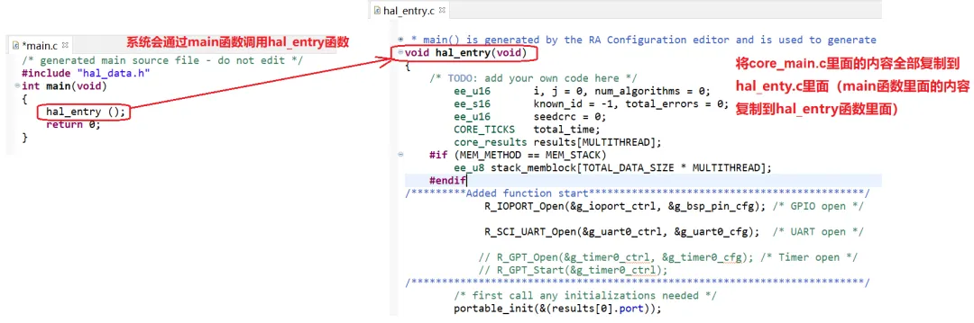 备注:该系统本身也会有一个main函数,该main函数里面会直接调用hal_entry函数,hal_entry.c文件是自动生成的,没办法删除,所以需要将core_main.c里面的内容全部复制到hal_entry.c文件里面,并且将里面的main(void)函数改成void hal_entry(void)。