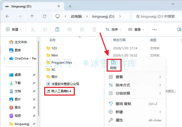 3.随便打开电脑上的一个磁盘,在打开的磁盘空白处,鼠标右键点击【粘贴】刚才复制的文件。