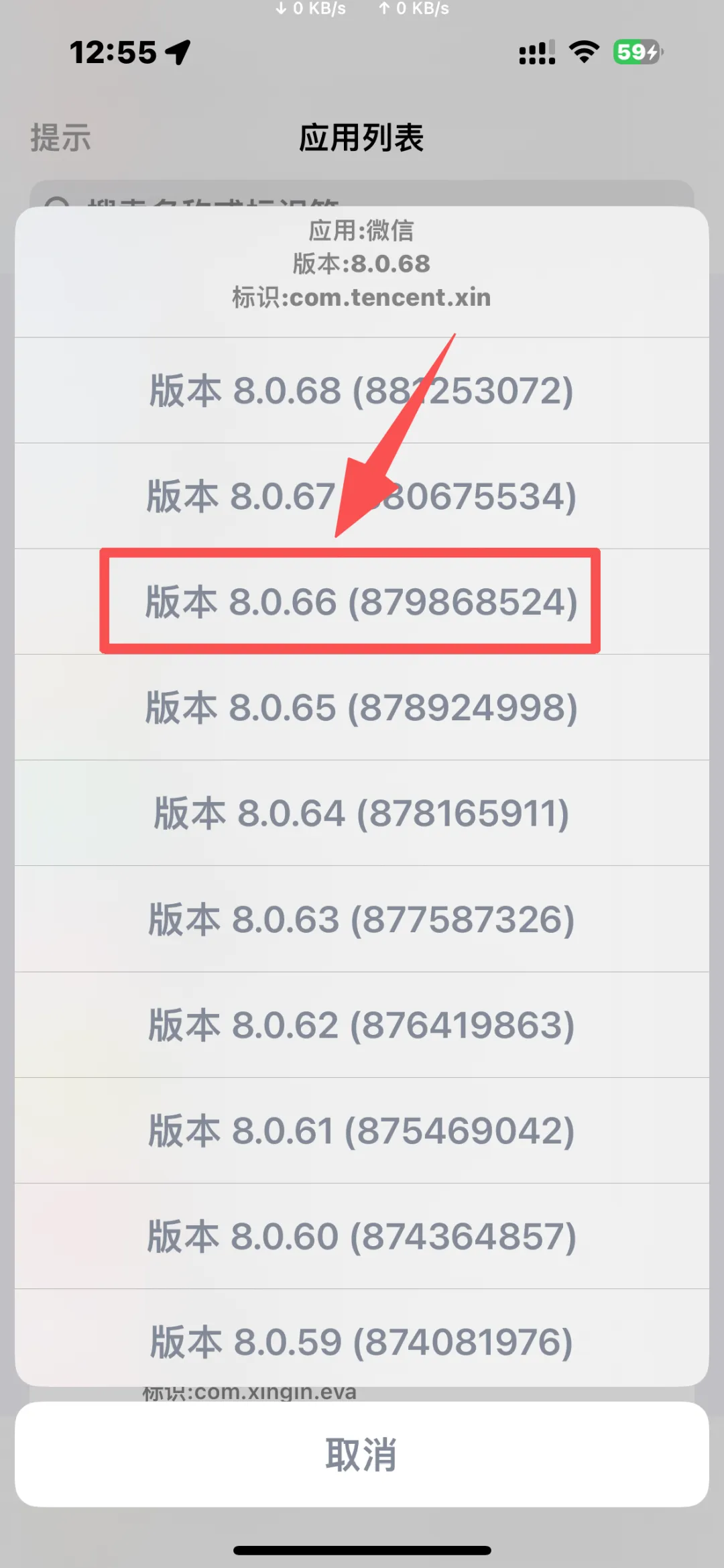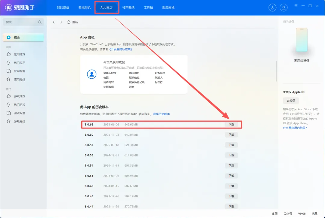 3、在爱思助手的“App商店”里面找到微信,往下滑就找到一个低版本(8.0.66),点击下载就可以给手机微信降级了;