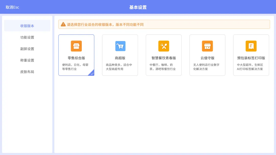 2.多版本切换:收银端支持零售版、商超版、轻餐饮、无人值守、预包装打印。