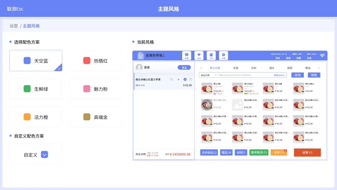 3.自定义主题风格:可自定义收银端的整体配色风格。