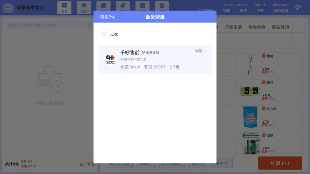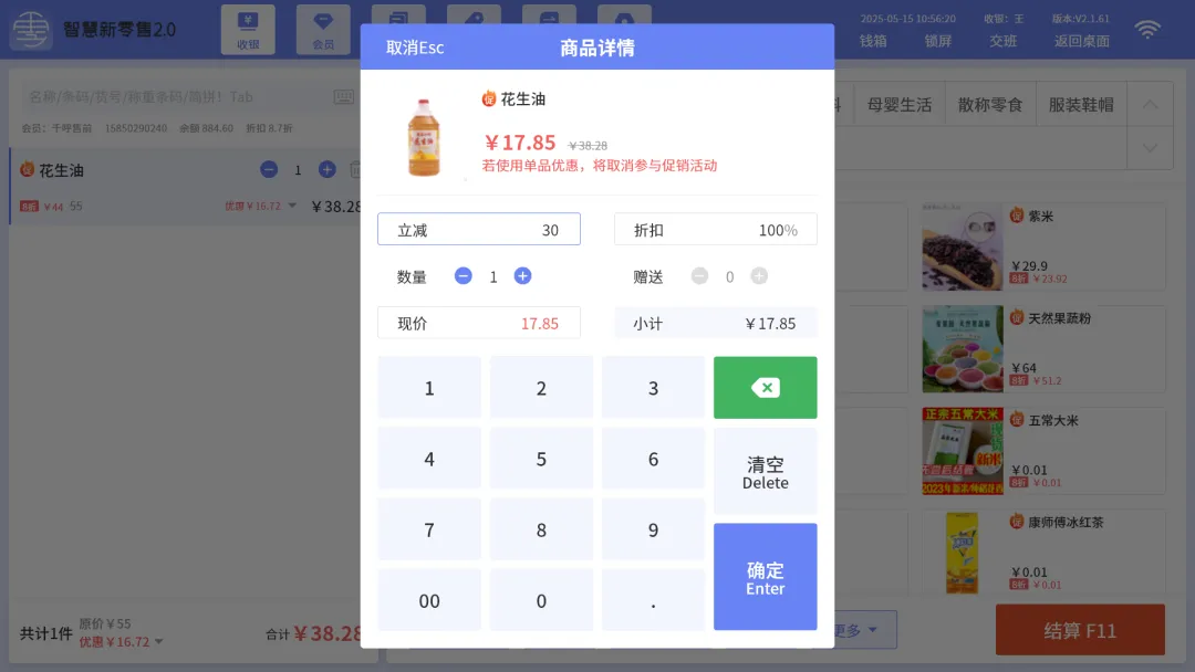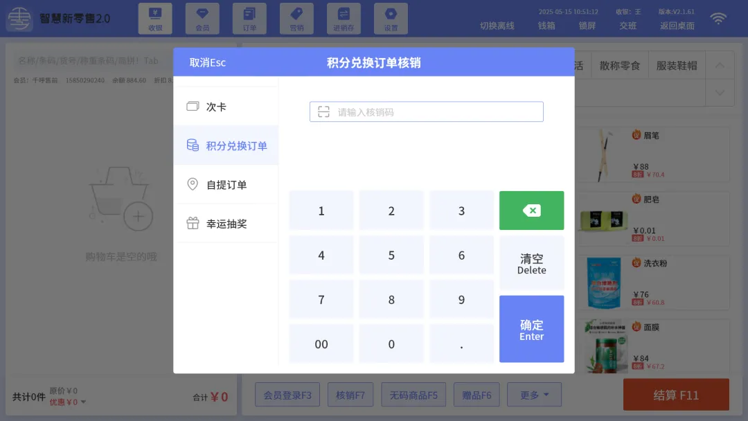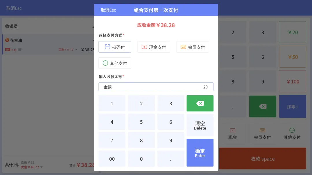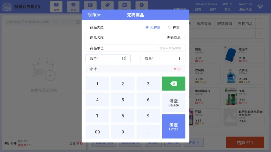 5.收银端重点功能:会员登录、订单核销、多规格、无码商品、改价打折、导购、组合支付