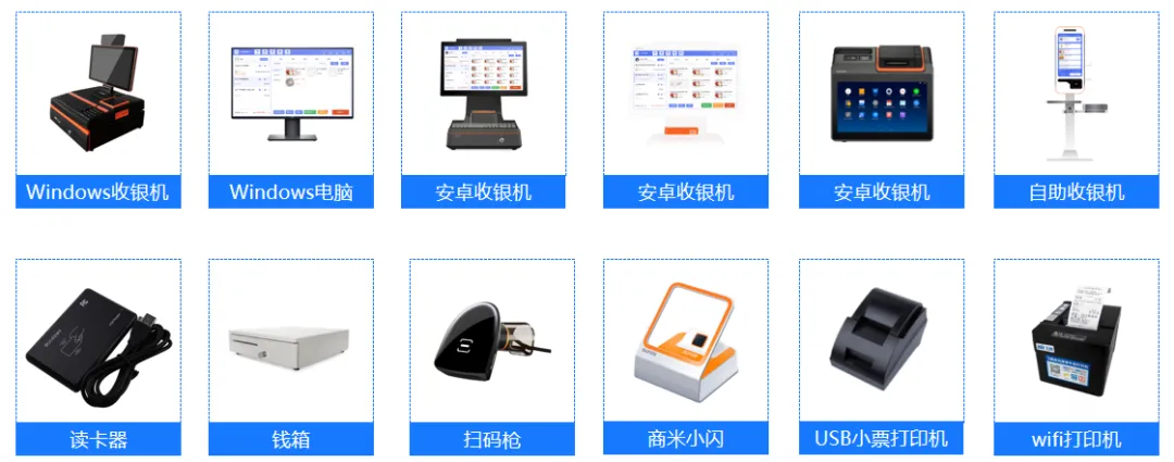 1.多场景收银:兼容市面上大多数主流收银硬件,安卓(APK)/Windows(EXE)双版本,支持Win/安卓收银机、称重收银收银机、AI称重、手机收银、无人自助、离线收银。