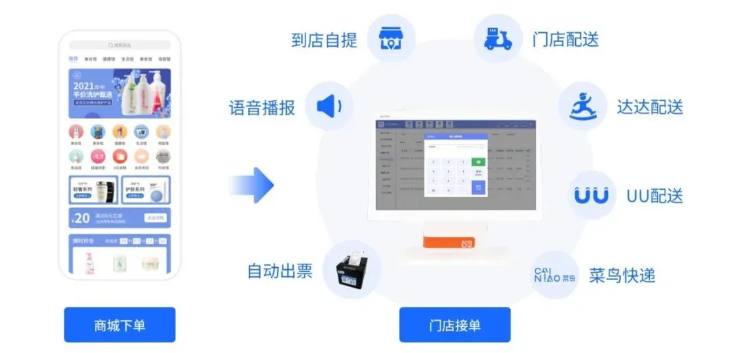 小程序线上商城与门店线下收银数据同步,同一后台管理。商品、库存、订单、会员数据全部打通,商城下单门店接单,可到店自提、门店配送、同城配送。对接翱象聚合平台,实现美团、闪购、京东零售门店与收银端打通,库存、订单同步管理。