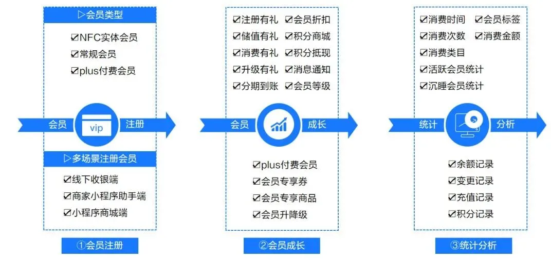 1.会员体系:完善的会员体系,等级折扣、充值赠送、积分体系等,支持NFC实体卡、购物卡,线上线下会员数据打通。