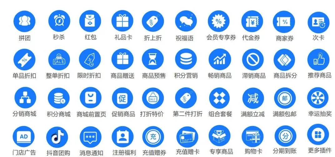 2.营销功能:丰富的线上线下营销功能,如二级分销、打折特价、满额立减、积分商城、秒杀预售等。