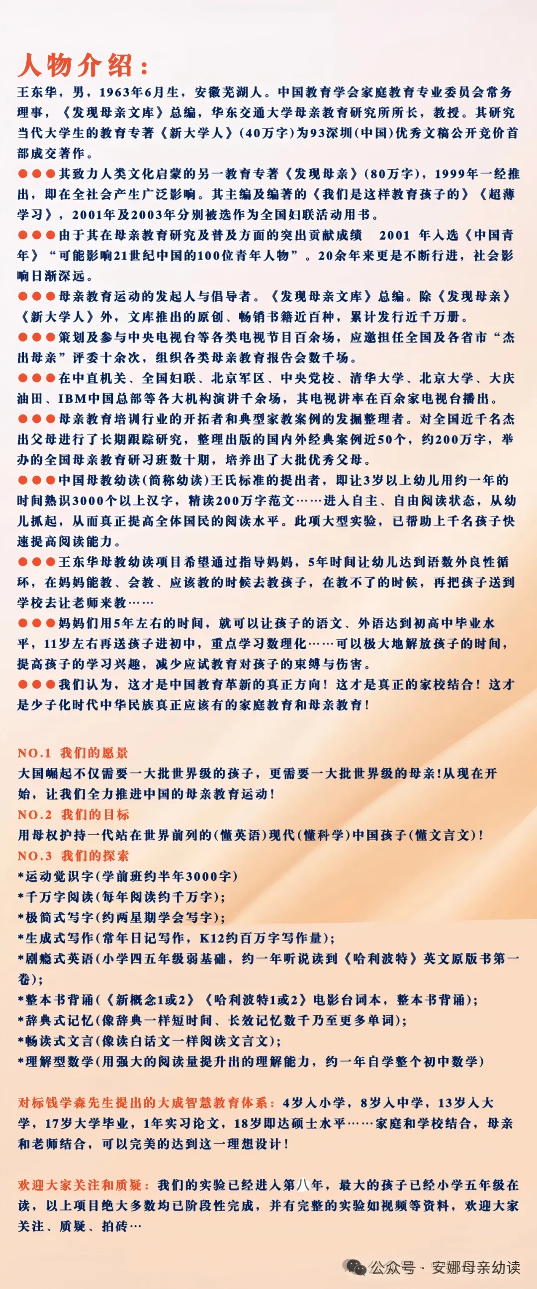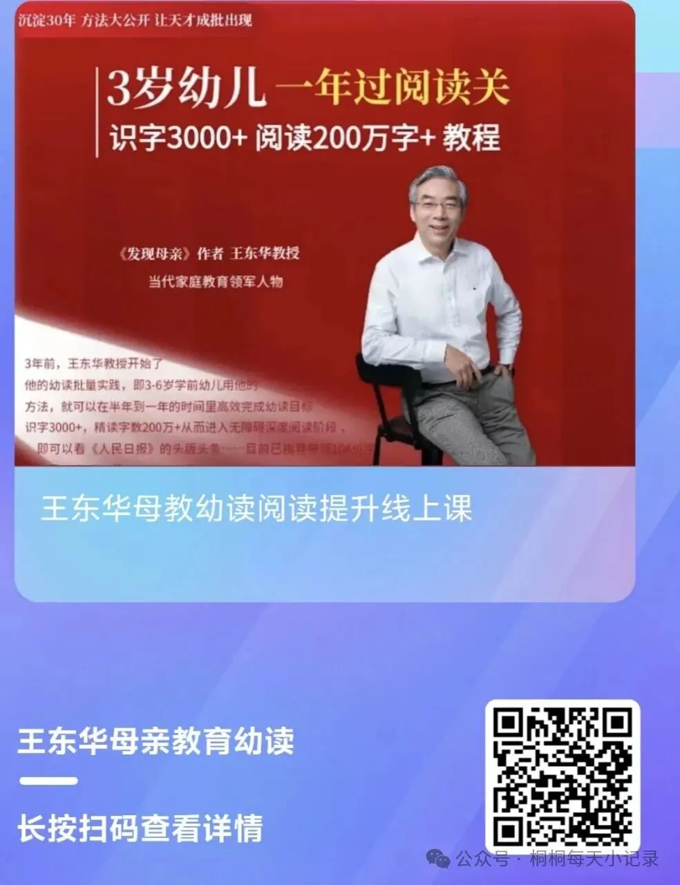 深入了解后我才知道,王东华教授深耕母亲教育三十余年,著有《发现母亲》等多部经典著作,六年前便开启母教幼读实践,至今已让无数家庭受益。他推广母亲教育从不以牟利为目的,而是希望通过普及母亲教育,提升全民素质,让更多孩子远离留守困境,减少成长中的焦虑与悲剧。识字阅读只是母教幼读的“抓手”,核心是唤醒父母的教育意识,用心陪伴孩子成长。