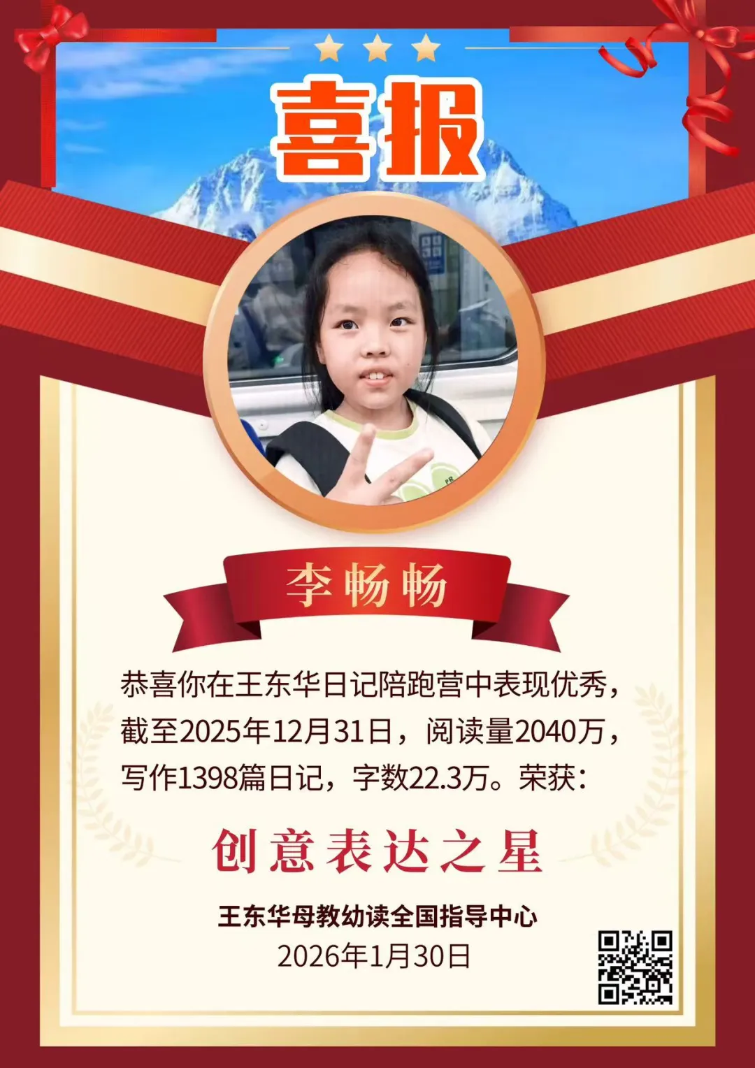 热烈祝贺李畅畅小朋友在王东华日记陪跑营中,表现优秀,截至2025年12月31日,阅读量2040万字,连续写作1398篇日记,累计22.3万字。荣获“创意表达之星”。