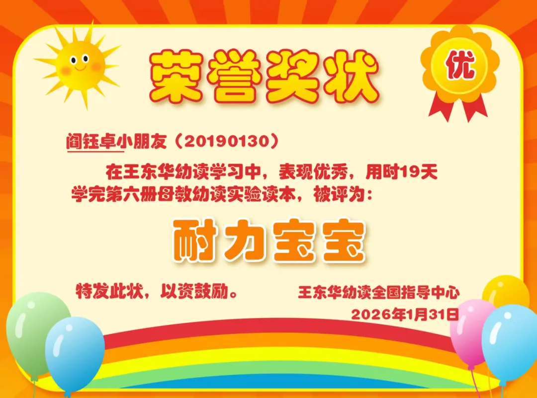 热烈祝贺阎钰卓小朋友在王东华幼读学习中,表现优秀,仅用19天读完第六册母教幼读教材,被评为:耐力宝宝!
