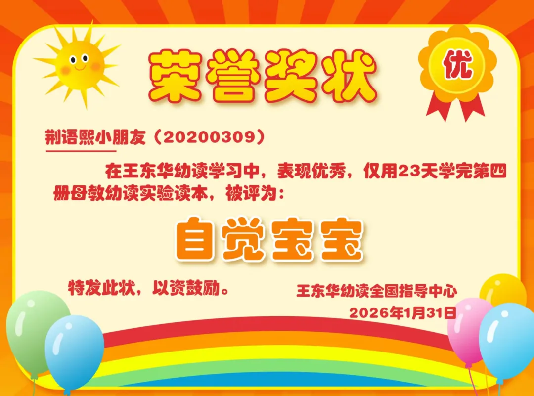 热烈祝贺荆语熙小朋友在王东华幼读学习中,表现优秀,仅用23天读完第四册母教幼读教材,被评为:自觉宝宝!