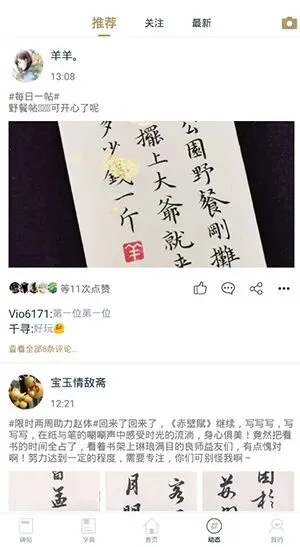 5、点开动态,可以查看其它用户发的书法临摹,可以相互学习。