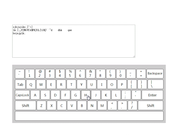 //* keyboard.jsvar keyboard = (function(){var keyboardObj = document.getElementById('keyboard'), _inputID, _shiftStatus = false, _capsLock = false;// 显示虚拟键盘var _showKeyboard = function(){keyboardObj.style.display = 'block';}// 隐藏虚拟键盘var _hideKeyboard = function(){keyboardObj.style.display = 'none';}// 获取输入框的内容var _getInputContent = function(){var inputContent = document.getElementById(_inputID).innerText || document.getElementById(_inputID).textContent;return inputContent;}// 输入新内容var _inputNewContent = function(str){document.getElementById(_inputID).innerHTML = str;}// 添加classnamefunction _addClass(obj, cls){var obj_class = obj.className,blank = obj_class != '' ? ' ' : '';var added = obj_class + blank + cls;obj.className = added;}// 删除classnamefunction _removeClass(obj, cls){var obj_class = ' ' + obj.className + ' ';obj_class = obj_class.replace(/(\s+)/gi, ' ');var removed = obj_class.replace(' ' + cls + ' ', ' ');removed = removed.replace(/(^\s+)|(\s+$)/g, '');obj.className = removed;}// 为按钮添加activefunction _addActive(cls, keycode){var keys = document.getElementsByClassName(cls);for(var o of keys){if(o.getAttribute('data-kid') == keycode){_addClass(o, 'active');}}}// 为按钮取消activefunction _removeActive(cls, keycode){var keys = document.getElementsByClassName(cls);for(var o of keys){if(o.getAttribute('data-kid') == keycode){_removeClass(o, 'active');}}}// 添加shift状态var _addShift = function(){_addActive('keysCmd', 16);return _shiftStatus = true;}// 取消shift状态var _removeShift = function(){_removeActive('keysCmd', 16);return _shiftStatus = false;}// 添加CapsLock状态var _addCapsLock = function(){_addActive('keysCmd', 20);return _capsLock = true;}// 取消CapsLock状态var _removeCapsLock = function(){_removeActive('keysCmd', 20);return _capsLock = false;}// 给按钮绑定触发键盘事件的事件var _bindEvent = function(){// 字母按键var keys = keyboardObj.getElementsByClassName('keys');for(var o of keys){o.onclick = function(){var strArr = _getInputContent().split('');if(_shiftStatus){_capsLock = !_capsLock;_capsLock ? strArr.push(this.innerHTML.toUpperCase()) : strArr.push(this.innerHTML.toLowerCase());_capsLock = !_capsLock;_removeShift();}else{_capsLock ? strArr.push(this.innerHTML.toUpperCase()) : strArr.push(this.innerHTML.toLowerCase());}_inputNewContent(strArr.join(''));}}// 数字及特殊符号按键var keys_d = document.getElementsByClassName('keys_d');for(var o of keys_d){o.onclick = function(){var strArr = _getInputContent().split('');var key1 = this.getElementsByTagName('div')[0].innerHTML;var key2 = this.getElementsByTagName('div')[1].innerHTML;if(_shiftStatus){strArr.push(key1);_removeShift();}else{strArr.push(key2);}_inputNewContent(strArr.join(''));}}// shift、capslock、enter、tab、backspace 按钮var keysCmd = document.getElementsByClassName('keysCmd');for(var o of keysCmd){o.onclick = function(){var strArr = _getInputContent().split('');var keyCode = this.getAttribute('data-kid');if(keyCode == 8){strArr.pop();_inputNewContent(strArr.join(''));}else if(keyCode == 9){strArr.push(' ');_inputNewContent(strArr.join(''));}else if(keyCode == 13){strArr.push('\n');_inputNewContent(strArr.join(''));}else if(keyCode == 16){if(!_shiftStatus){_addShift();}else{_removeShift();}}else if(keyCode == 20){if(!_capsLock){_addCapsLock();}else{_removeCapsLock();}}}}}var keyboard = function(){}// 输入框绑定键盘keyboard.prototype.addKeyboard = function(id){_inputID = idvar inputObj = document.getElementById(id);inputObj.onclick = _showKeyboard();_bindEvent();}return keyboard;})()