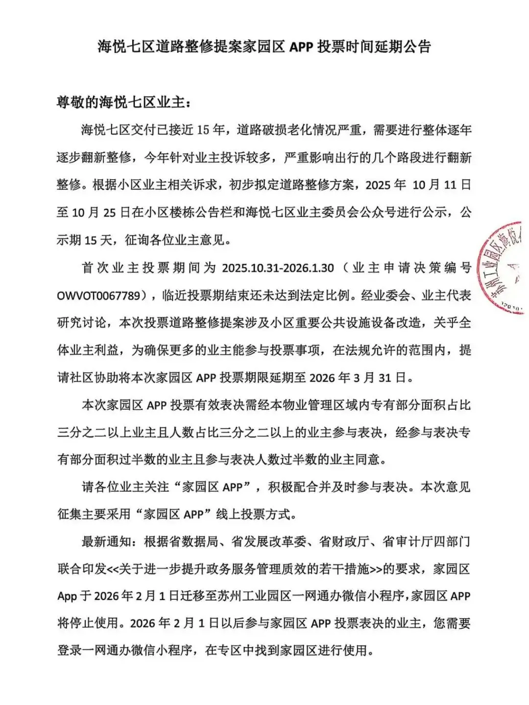 海悦七区道路整修提案家园区APP投票时间延期公告