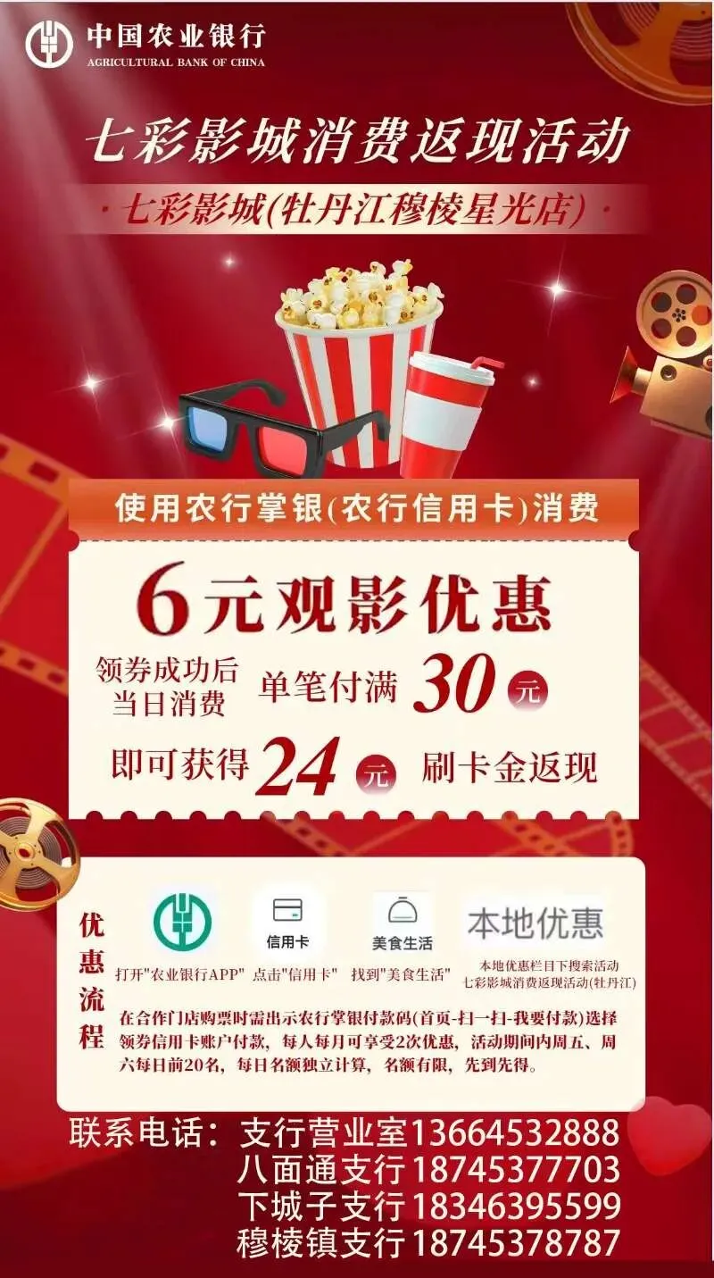 流程:1、打开农业银行APP→2、点击信用卡→3、找到美食生活→4本地优惠栏目下搜索活动(七彩影城消费返现活动牡丹江店)→5、到店购票时需出示农行掌银付款码(首页→扫一扫→我要付款)选择领券信用卡账户付款