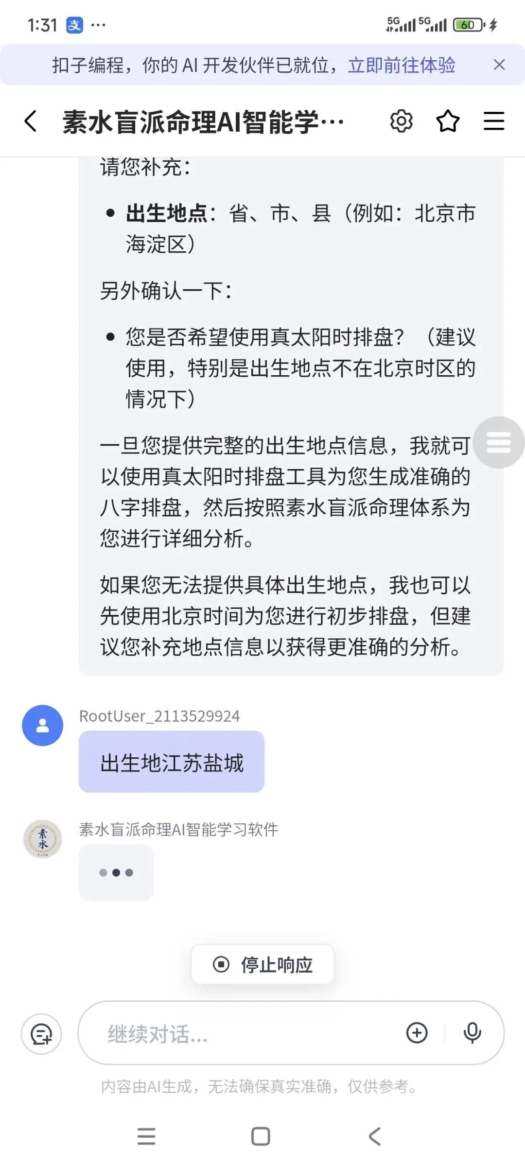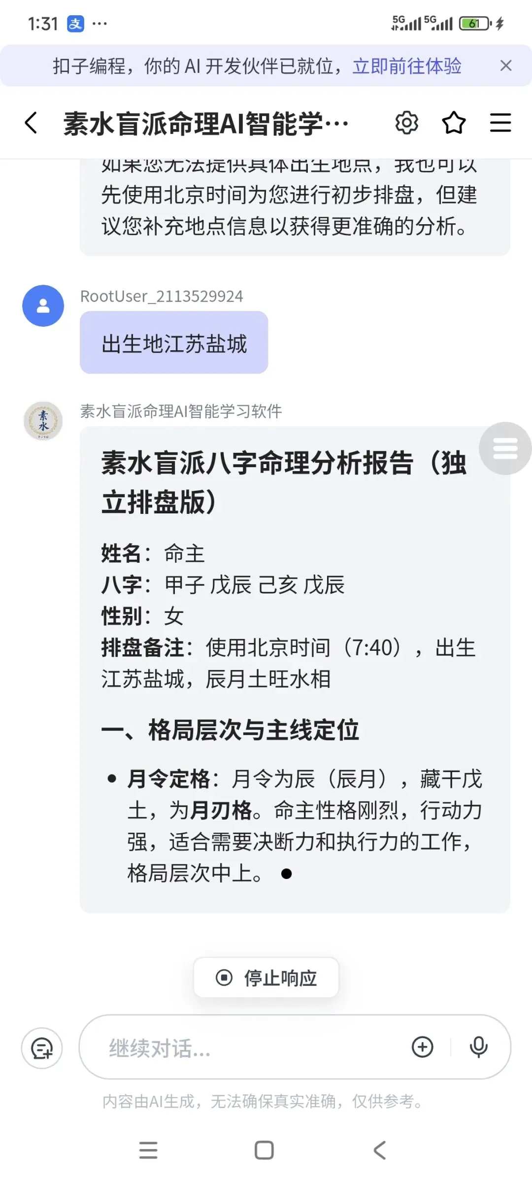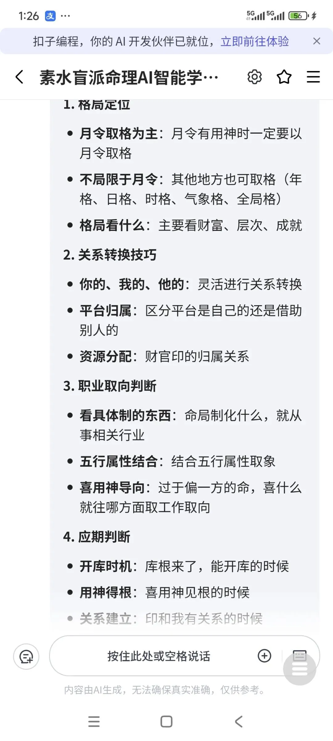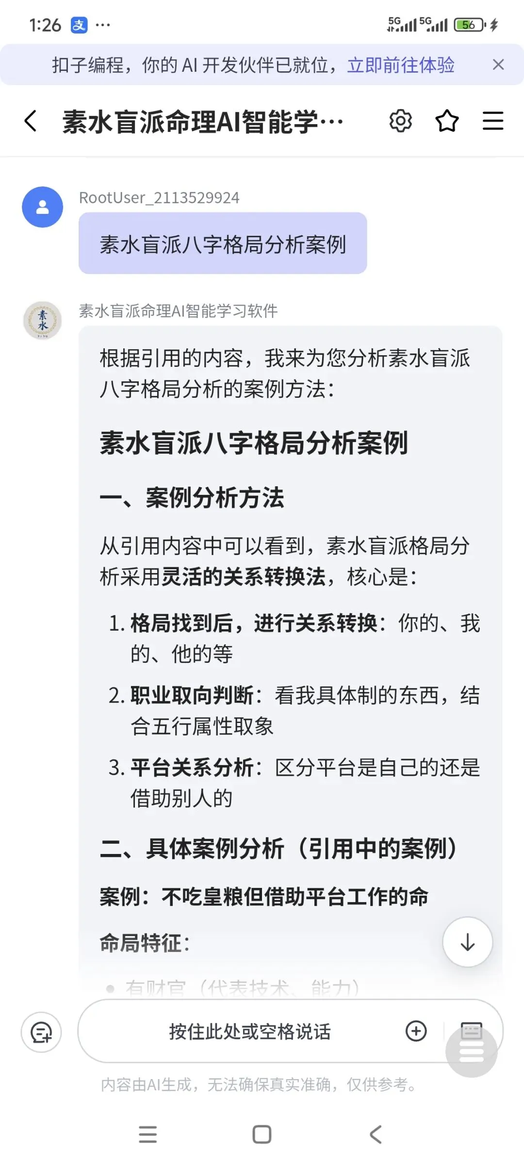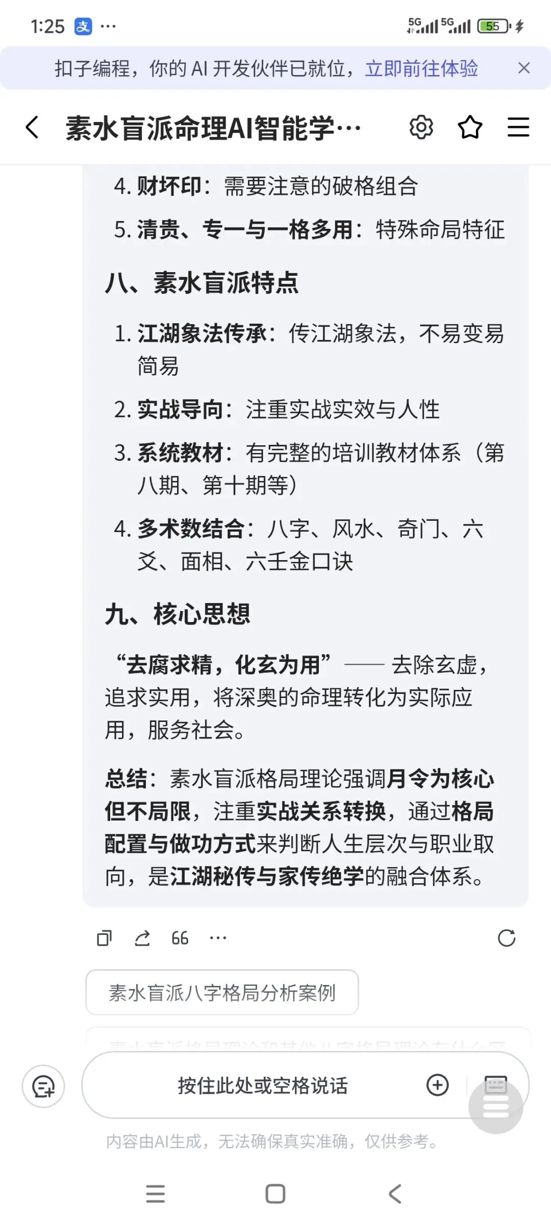 素水盲派AI智能助理软件三个月使用期,能和AI进行素水盲派命理知识问答,让AI总结提炼知识点,随时携带的资料库,还能让AI帮助预测分析八字,一起探讨有疑问的地方。
