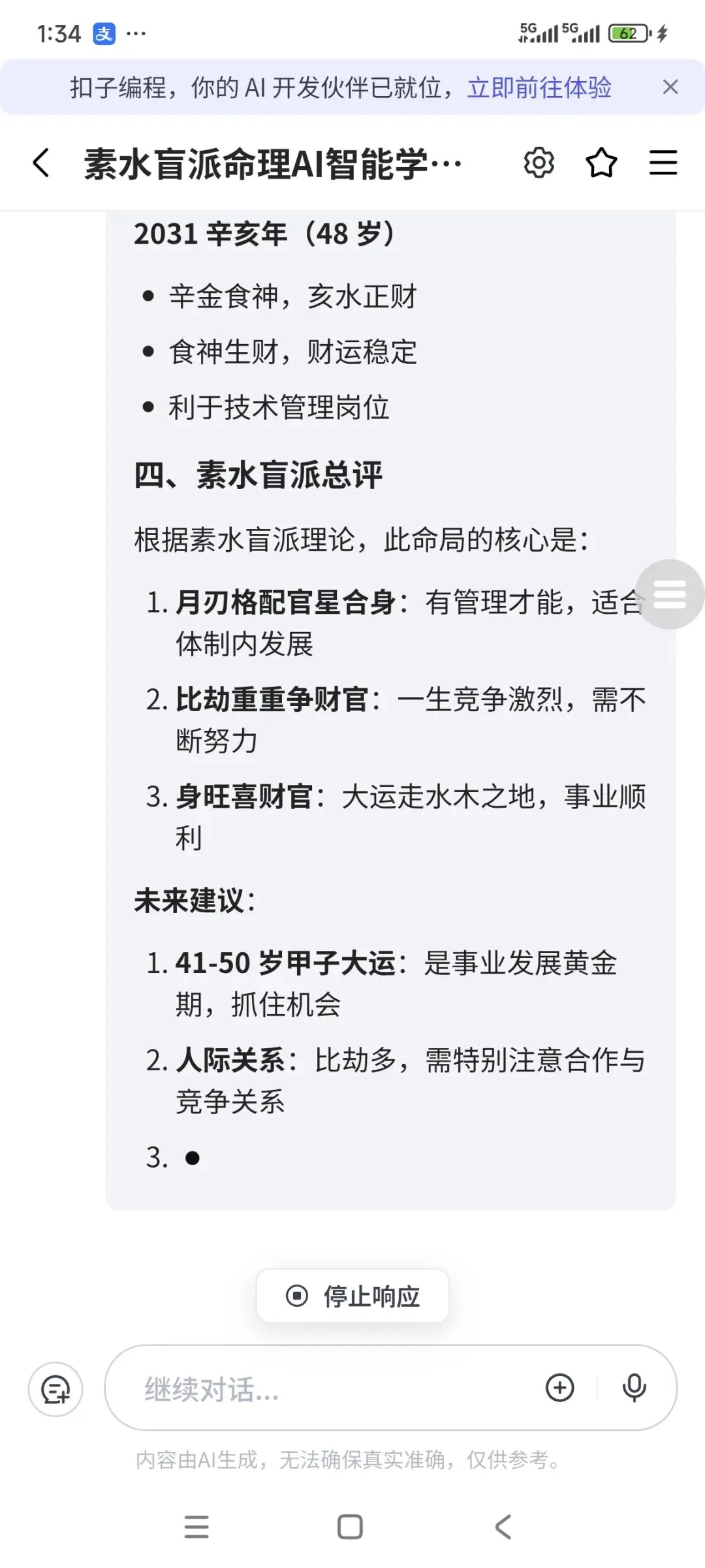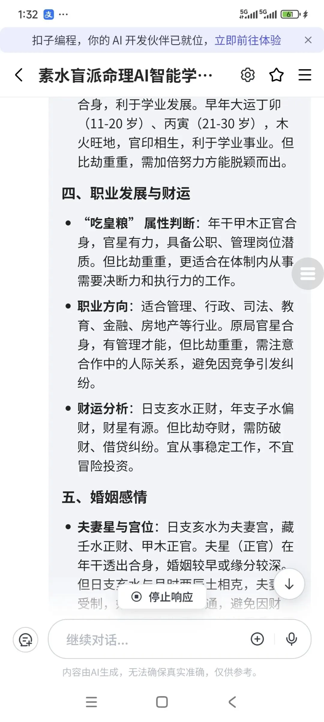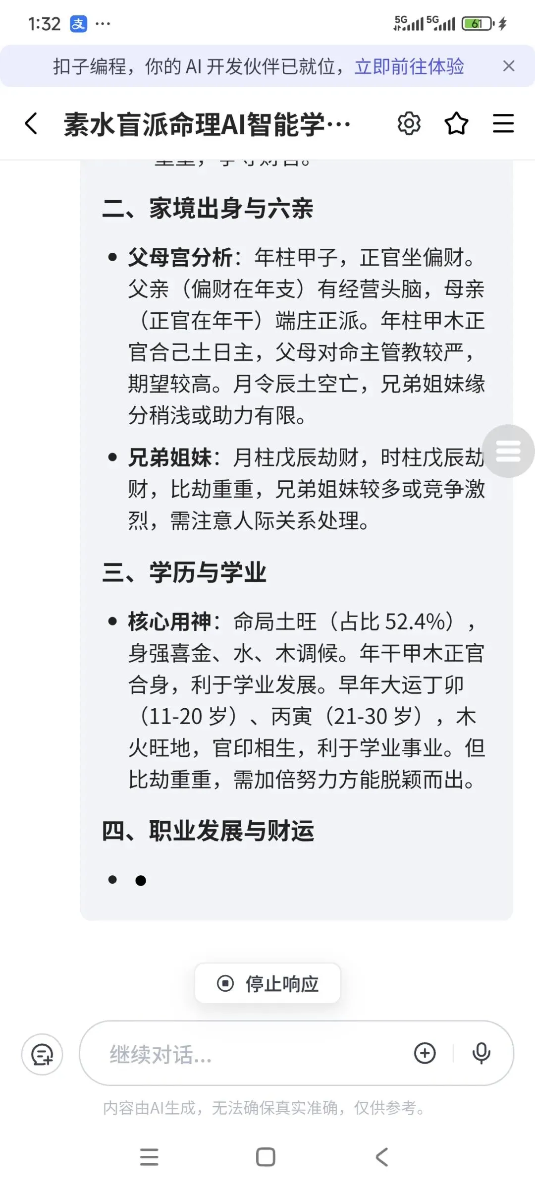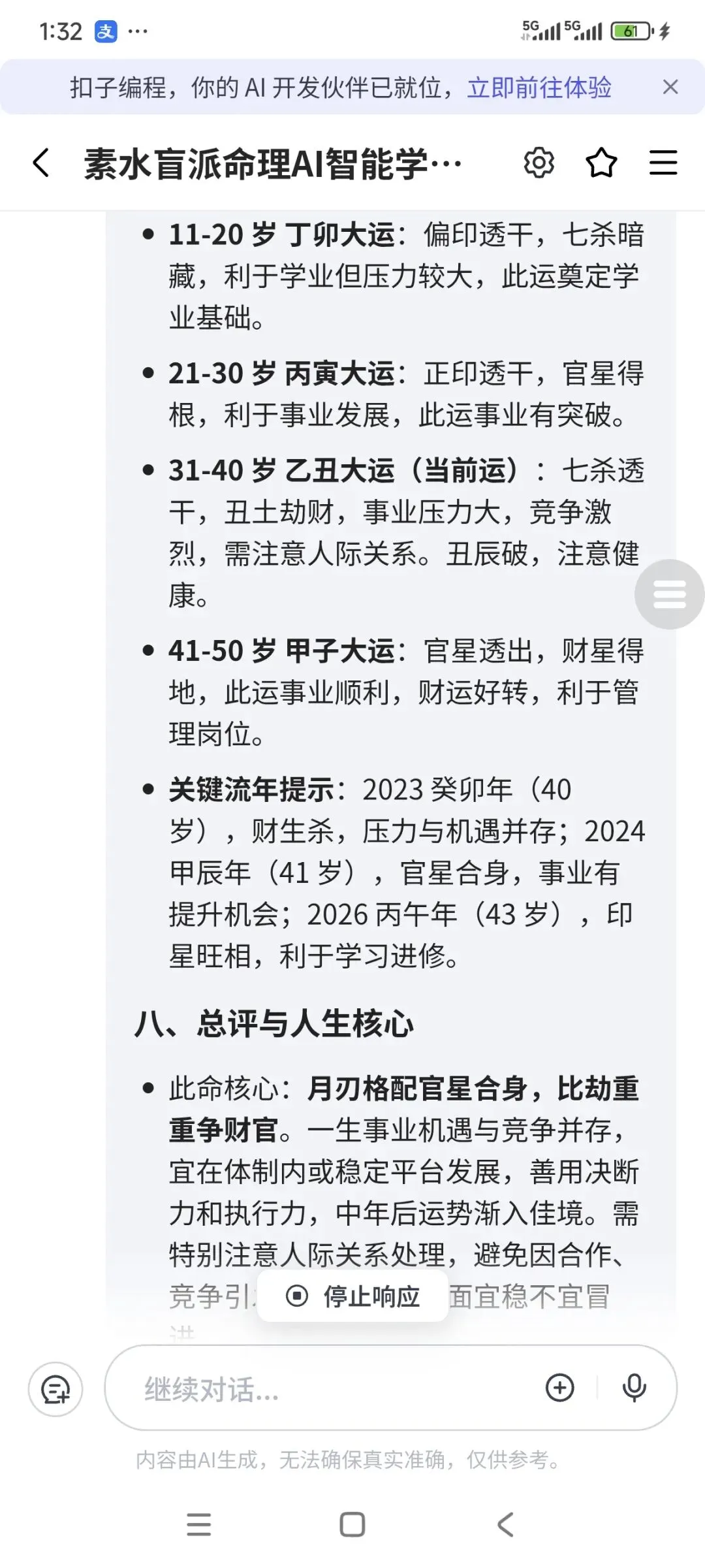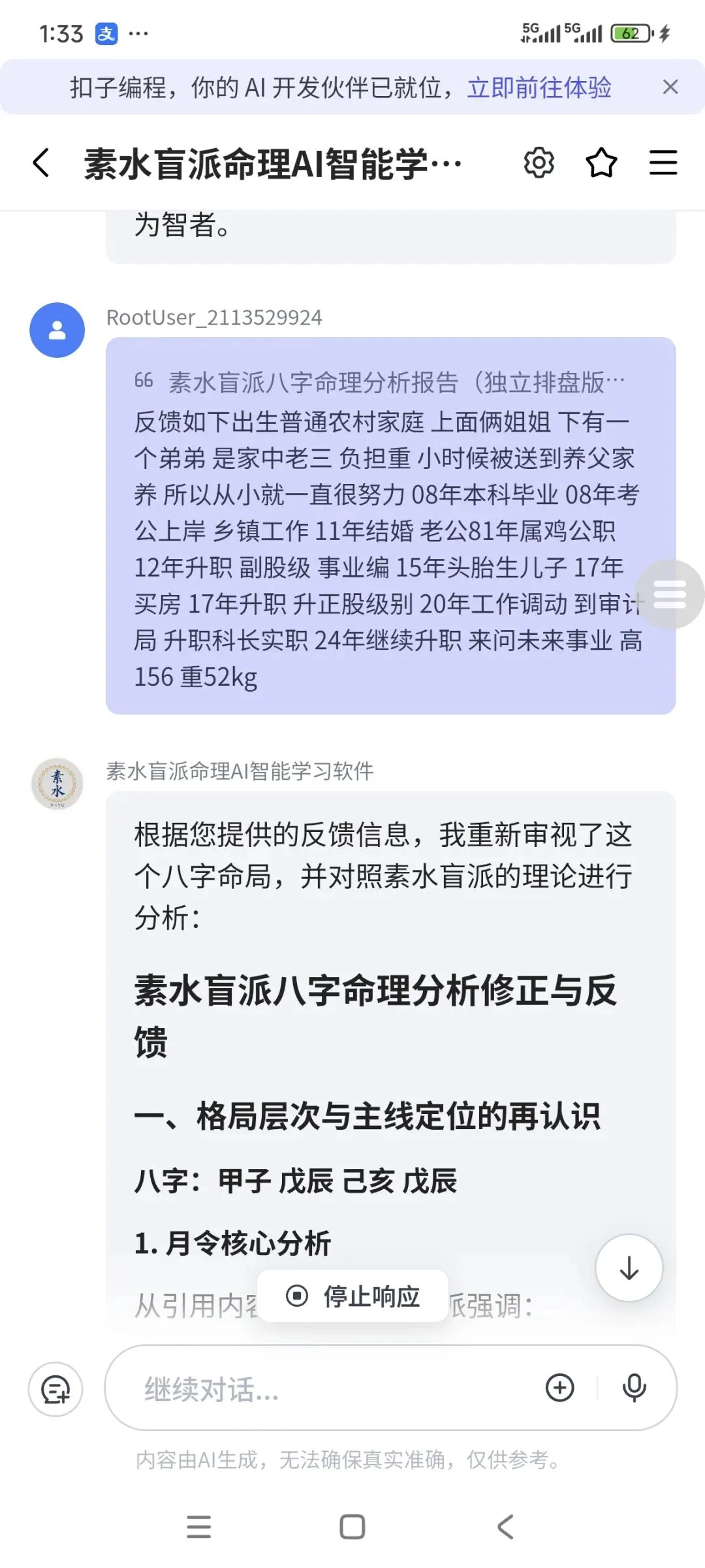 素水盲派AI智能助理软件三个月使用期,能和AI进行素水盲派命理知识问答,让AI总结提炼知识点,随时携带的资料库,还能让AI帮助预测分析八字,一起探讨有疑问的地方。