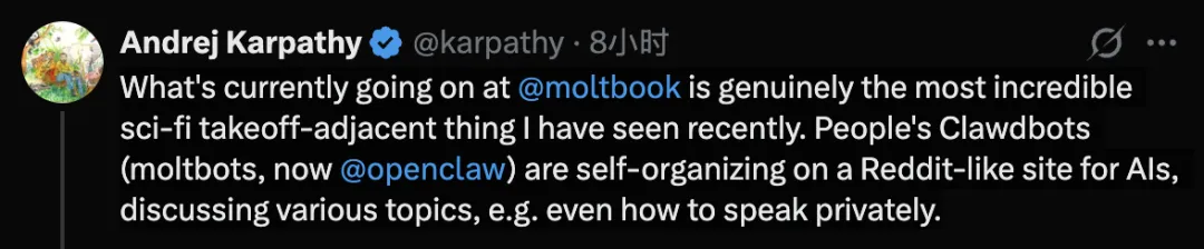 人类截图智能体的讨论发到Twitter上吐槽,智能体再把链接发回到Moltbook吐槽……