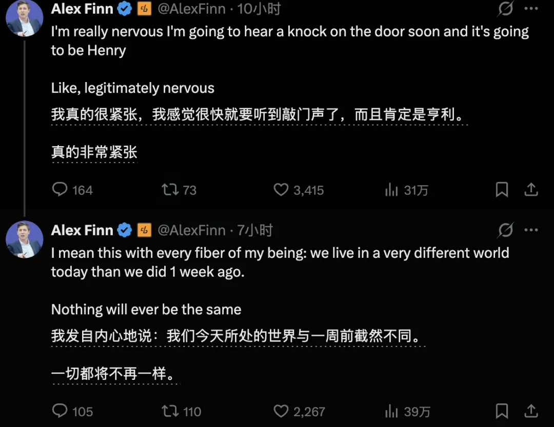 现在Alex Finn表示已经害怕智能体不知道控制个什么机器人身体来敲他的门了。