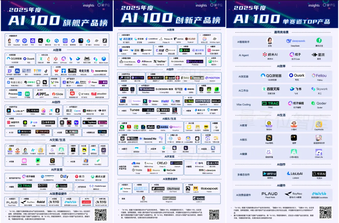 量子位智库通过三大板块——最强综合实力的「旗舰AI 100」、最具未来潜力的「创新AI 100」和十大热门赛道代表产品,全面梳理2025年度国内C端AI产品的发展脉络与创新成果。