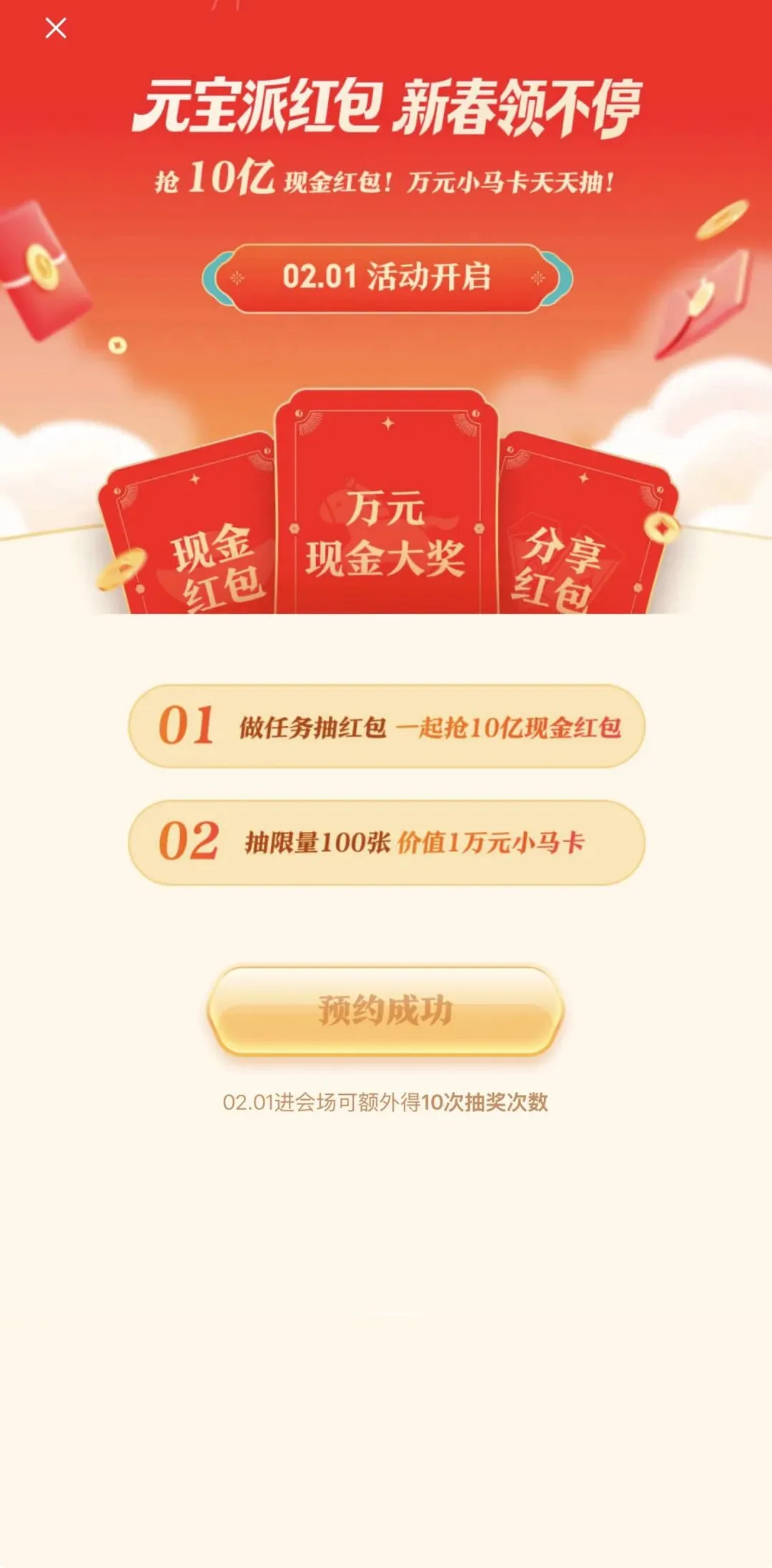 元宝将在2月1日开启新春活动,分10亿现金红包。可以体验AI新玩法、抢红包,最高可得万元。