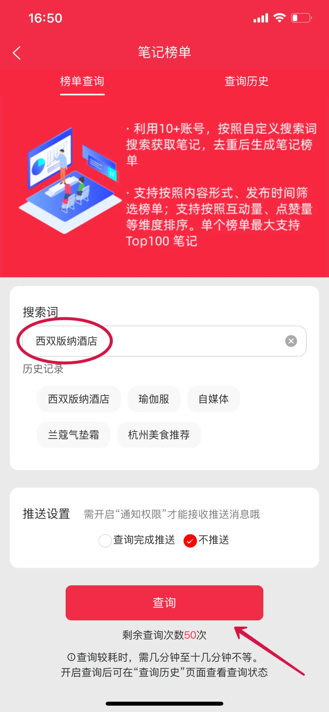 进入查笔记-「自定义搜索词」笔记榜单功能页面后,输入需要查询的搜索词,比如:西双版纳酒店,点击「查询」。