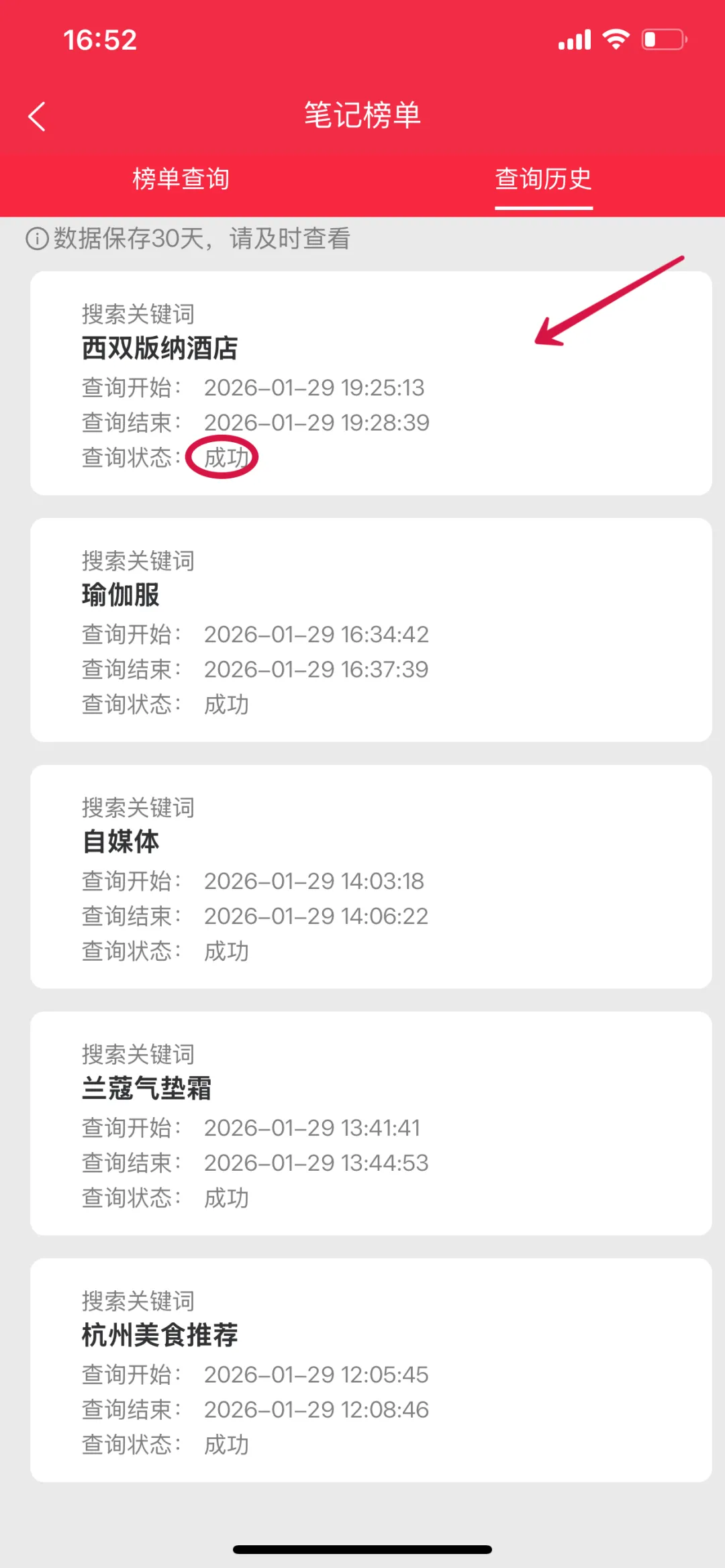 2. 进入「查询历史」页面,稍等几分钟,如果查询状态更新为:成功,点击任务卡片,进入数据详情页面查询榜单。