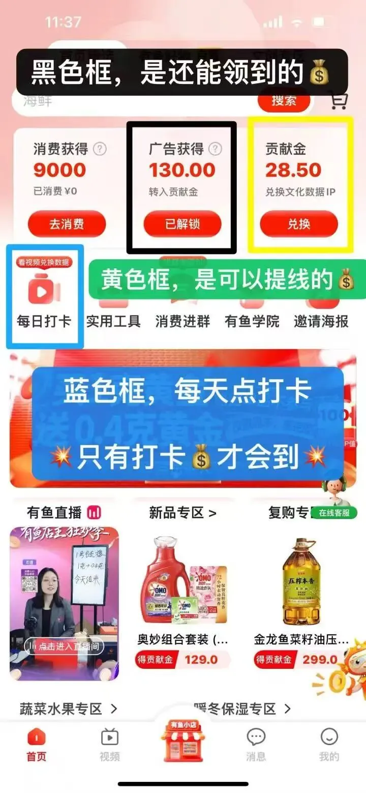 更惊喜的是小额投入高回报的补贴活动:新人花9.9元下单抽纸、洗衣液等超值日用品,首月每天只需5分钟看4个广告,就能解锁310元补贴,后续每月还有160元稳定收益,轻松覆盖水电费、交通费等日常开支。此外,每日签到、分享商品、购物消费都能累积贡献金,攒到一定数量就能兑换厨房用纸、洗衣液甚至黄金饰品,让每一次日常互动都能转化为实际价值。