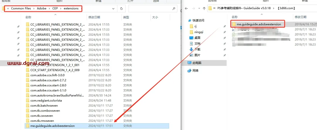 复制me.guideguide.adobeextension文件夹到【C:Program Files (x86)Common FilesAdobeCEPextensions】路径下