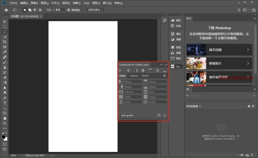 打开PS软件,新建文档,点击窗口-扩展功能-GuideGuide for CGPeers users