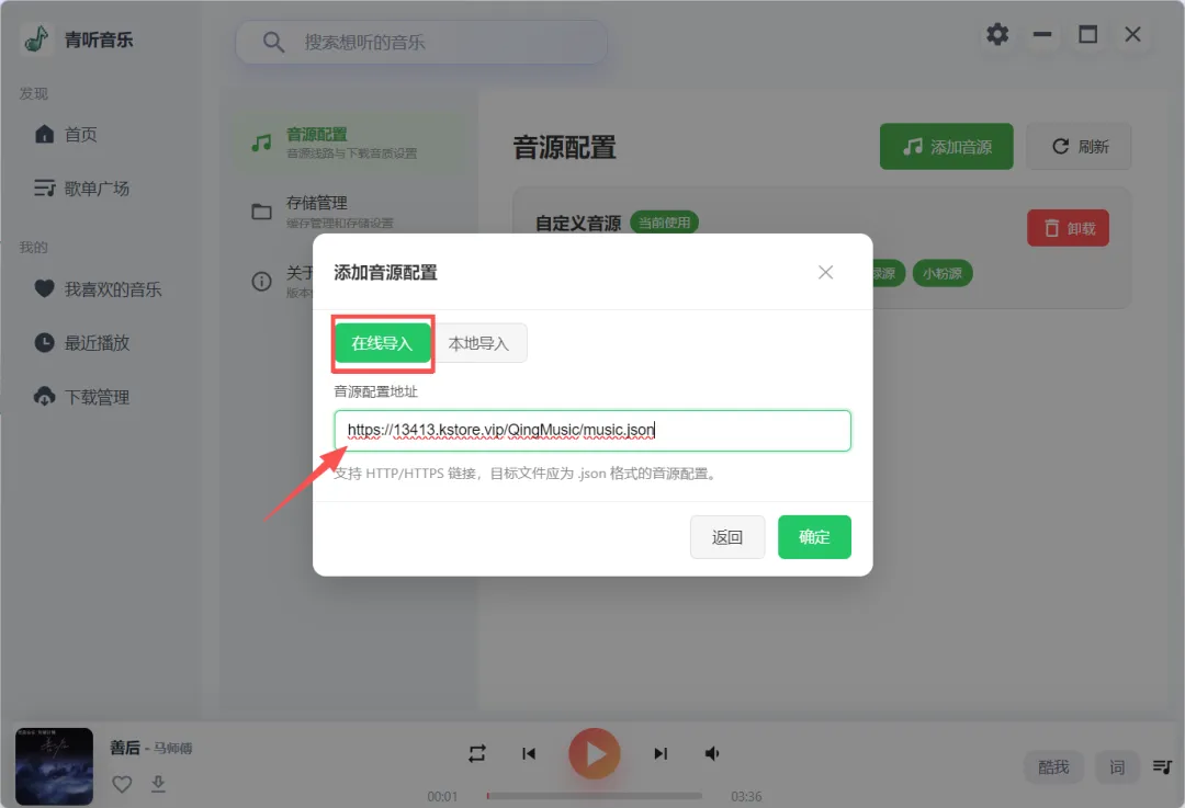 第二步☝点击【添加音源】,点击【在线导入】,把这段音源地址复制进去,点击【确定】即可