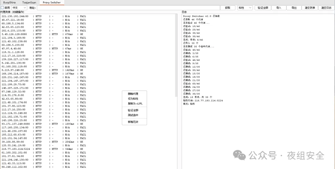 [启用] [中文] 地址:[________] [获取] [模式下拉] [验证全部] [导入] [导出] [清空列表] [清空日志]┌──────────────────────────────────────────────────────────────┐│ 代理列表(右键操作) ││ 1.2.3.4:8080 | HTTP | HTTP | 128ms | OK ││ 5.6.7.8:1080 | SOCKS5 | - | 892ms | OK ││ ... │└──────────────────────────────────────────────────────────────┘┌───────────────────────────────────────┐│ 日志 ││ Plugin Enabled ││ 已获取 128 个代理 ││ [Repeater] Using: 1.2.3.4:8080 │└───────────────────────────────────────┘