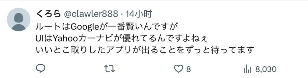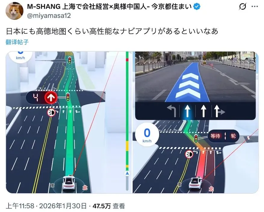 日本网民:要是日本也有像中国的地图APP一样强大的导航就好了 不知你有没有感觉,现在的导航APP越来越厉害了。以前的汽车上那个很卡的导航,已经被百度和高德地图替代。不仅有了红绿灯倒计时,还能实现精准的车道级导航。而且,日本人看了也表示羡慕。 1月30日,一名曾经在中国创业、老婆是中国人、现居京都的日本人在X上发帖感慨,“要是日本也能有像高德地图一样强大的导航APP就好了”。 他贴出了两张高德地图的截图 日本人用的最多的导航,主要是谷歌地图和雅虎日本的导航,但是似乎很多功能还不够完善。 对此,日本网民议论纷纷: 谷歌地图在路线规划方面最聪明,但雅虎车载导航的UI更厉害。我一直在等待一款能够结合两者优势的APP。 想要。 真厉害 对于需要详细说明才能抵达目的地的人来说,这是必备的东西! 红绿灯倒计时→日本绝对无法引进这种功能。因为这会妨碍日本警察利用自身利益收取罚款……日本没救了 表示赞同 但是中国人开车技术很差 还有疑似中国网民加入吐槽: