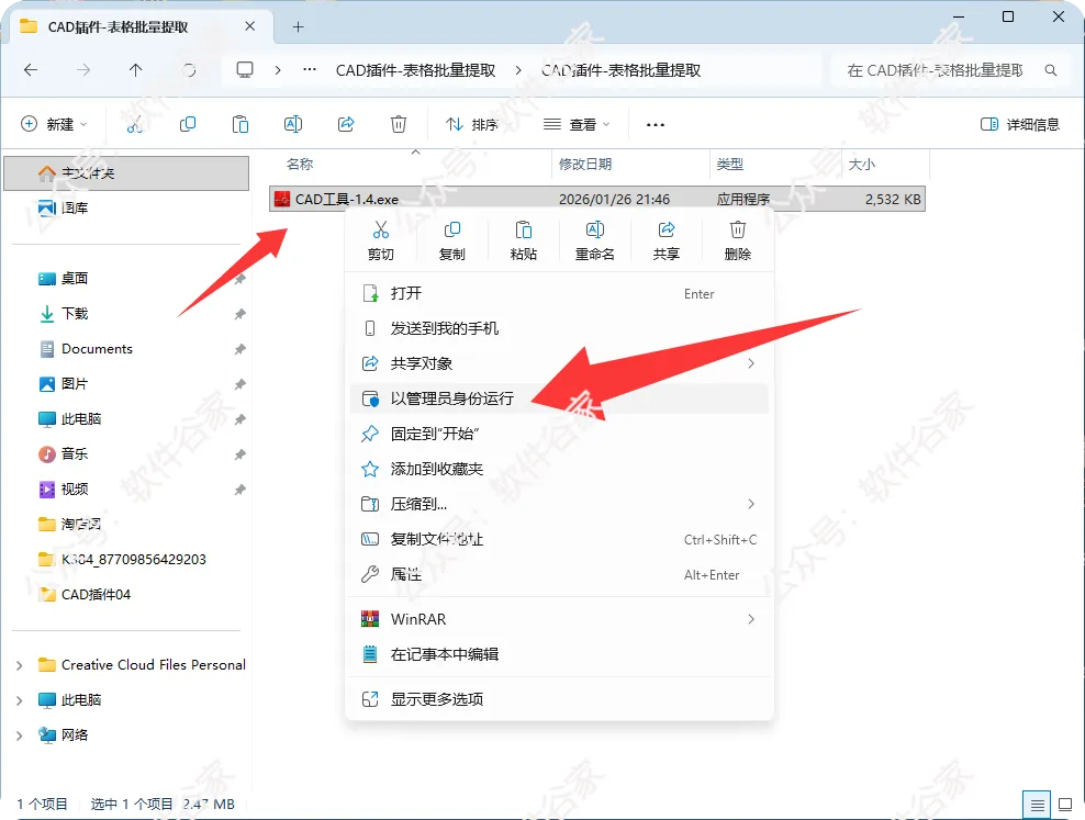 关闭AutoCAD→右键“CAD工具-1.4.exe”→“以管理员身份运行”→连续点击“下一步”完成安装。