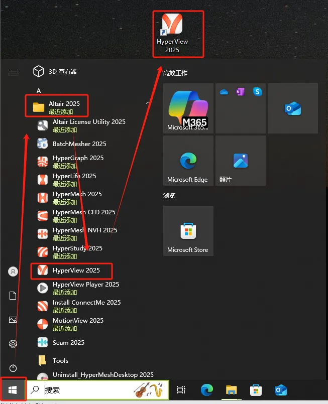 第二十四步:依次点击开始,Altair 2025文件夹,找到hyperView,将其拖到桌面。
