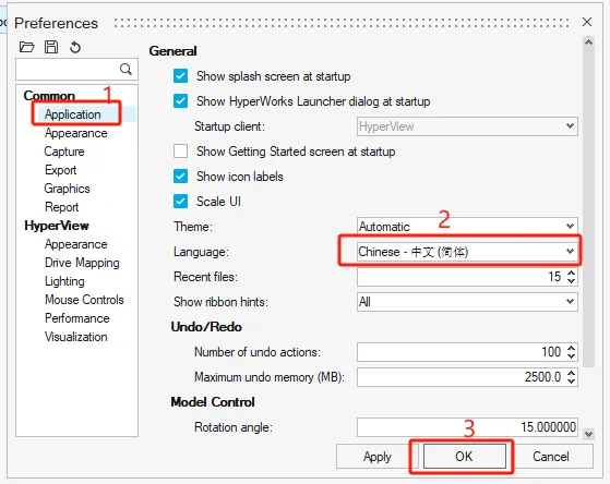 第三十三步:选择【application】,language位置选择【中文(简体)】,然后点【ok】,重启软件。
