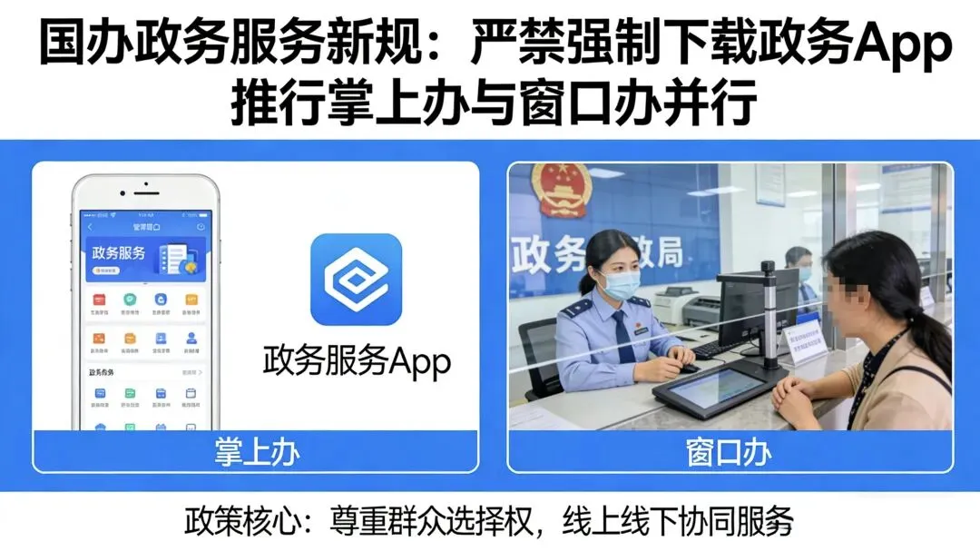近日,国务院办公厅印发政务服务相关管理新规,针对当前政务移动应用推广使用中的突出问题,作出明确规范要求,核心聚焦不得强制要求下载政务App,全面推行“掌上办”与“窗口办”双线并行服务模式,着力整治“指尖上的形式主义”,推动政务服务回归便民利企的本质初衷,切实提升群众和企业的办事体验。