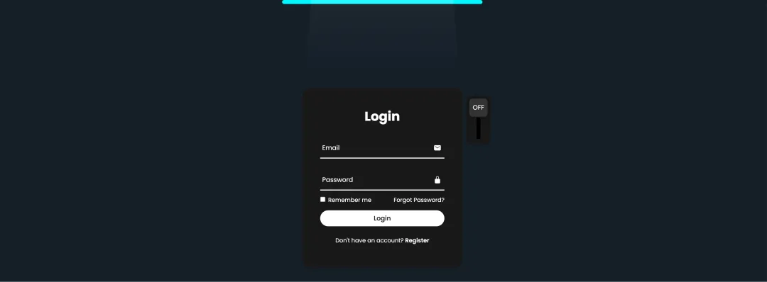 @import url('https://fonts.googleapis.com/css2?family=Poppins:wght@300;400;500;600;700;800;900&display=swap');* {margin: 0;padding: 0;box-sizing: border-box;font-family: 'Poppins', sans-serif;}body {display: flex;justify-content: center;align-items: center;min-height: 100vh;background: #151f28;overflow: hidden;}.login-box {position: relative;width: 400px;height: 450px;background: #191919;border-radius: 20px;display: flex;justify-content: center;align-items: center;}h2 {font-size: 2em;color: #fff;text-align: center;transition: .5s ease;}.input-check:checked~h2 {color: #00f7ff;text-shadow:0 0 15px #00f7ff,0 0 30px #00f7ff;}.input-box {position: relative;width: 310px;margin: 30px 0;}.input-box .input-line {position: absolute;bottom: -2px;left: 0;width: 100%;height: 2.5px;background: #fff;transition: .5s ease;}.input-check:checked~.input-box .input-line {background: #00f7ff;box-shadow: 0 0 10px #00f7ff;}.input-box label {position: absolute;top: 50%;left: 5px;transform: translateY(-50%);font-size: 1em;color: #fff;pointer-events: none;transition: .5s ease;}.input-box input:focus ~ label,.input-box input:not(:placeholder-shown) ~ label {top: -5px;}.input-check:checked~.input-box label {color: #00f7ff;text-shadow: 0 0 10px #00f7ff;}.input-box input {width: 100%;height: 50px;background: transparent;border: none;outline: none;font-size: 1em;color: #fff;padding: 0 35px 0 5px;transition: .5s ease;}.input-check:checked~.input-box input {color: #00f7ff;text-shadow: 0 0 5px #00f7ff;}.input-box .icon {position: absolute;right: 8px;color: #fff;font-size: 1.2em;line-height: 57px;transition: .5s ease;}.input-check:checked~.input-box .icon {color: #00f7ff;filter: drop-shadow(0 0 5px #00f7ff);}.remember-forgot {color: #fff;font-size: .9em;margin: -15px 0 15px;display: flex;justify-content: space-between;transition: .5s ease;}.input-check:checked~.remember-forgot {color: #00f7ff;text-shadow: 0 0 10px #00f7ff;}.remember-forgot label input {accent-color: #fff;margin-right: 3px;transition: .5s ease;}.input-check:checked~.remember-forgot label input {accent-color: #00f7ff;}.remember-forgot a {color: #fff;text-decoration: none;transition: color .5s ease;}.remember-forgot a:hover {text-decoration: underline;}.input-check:checked~.remember-forgot a {color: #00f7ff;}button {width: 100%;height: 40px;background: #fff;border: none;outline: none;border-radius: 40px;cursor: pointer;font-size: 1em;color: #191919;font-weight: 500;transition: .5s ease;}.glowing-light {position: absolute;top: 0;left: 50%;transform: translateX(-50%);width: 500px;height: 10px;background: #00f7ff;border-radius: 20px;}.input-check:checked~button {background: #00f7ff;box-shadow: 0 0 15px #00f7ff, 0 0 15px #00f7ff;}.register-link {color: #fff;font-size: .9em;text-align: center;margin: 25px 0 10px;transition: .5s ease;}.input-check:checked~.register-link {color: #00f7ff;text-shadow: 0 0 10px #00f7ff;}.register-link p a {color: #fff;text-decoration: none;font-weight: 600;transition: color .5s ease;}.register-link p a:hover {text-decoration: underline;}.input-check:checked~.register-link p a {color: #00f7ff;}.light {position: absolute;top: -200%;left: 0;width: 100%;height: 950px;background: linear-gradient(to bottom, rgba(255, 255, 255, .3) -50%, rgba(255, 255, 255, 0) 90%);clip-path: polygon(20% 0, 80% 0, 100% 100%, 0 100%);pointer-events: none;transition: .5s ease;}.input-check:checked~.light {top: -90%;}.toggle {position: absolute;top: 20px;right: -70px;width: 60px;height: 120px;background: #191919;border-radius: 10px;}.toggle::before {content: '';position: absolute;top: 50%;left: 50%;transform: translate(-50%, -50%);width: 10px;height: 80%;background: #000;}.toggle::after {content: '';position: absolute;top: 5px;left: 50%;transform: translateX(-50%);width: 45px;height: 45px;background: #333;border: 2px solid #191919;border-radius: 10px;cursor: pointer;box-shadow: 0 0 10px rgba(0, 0, 0, .5);transition: .5s ease;}.input-check:checked~.toggle::after {top: 65px;}.input-check {position: absolute;right: -70px;z-index: 1;opacity: 0;}.toggle .text {position: absolute;top: 17px;left: 50%;transform: translateX(-50%);color: #fff;font-size: 1em;z-index: 1;text-transform: uppercase;pointer-events: none;transition: .5s ease;}.toggle .text.off {opacity: 1;}.input-check:checked~.toggle .text.off {top: 76px;opacity: 0;}.toggle .text.on {opacity: 0;}.input-check:checked~.toggle .text.on {top: 76px;opacity: 1;color: #00f7ff;text-shadow:0 0 15px #00f7ff,0 0 30px #00f7ff,0 0 45px #00f7ff,0 0 60px #00f7ff;}