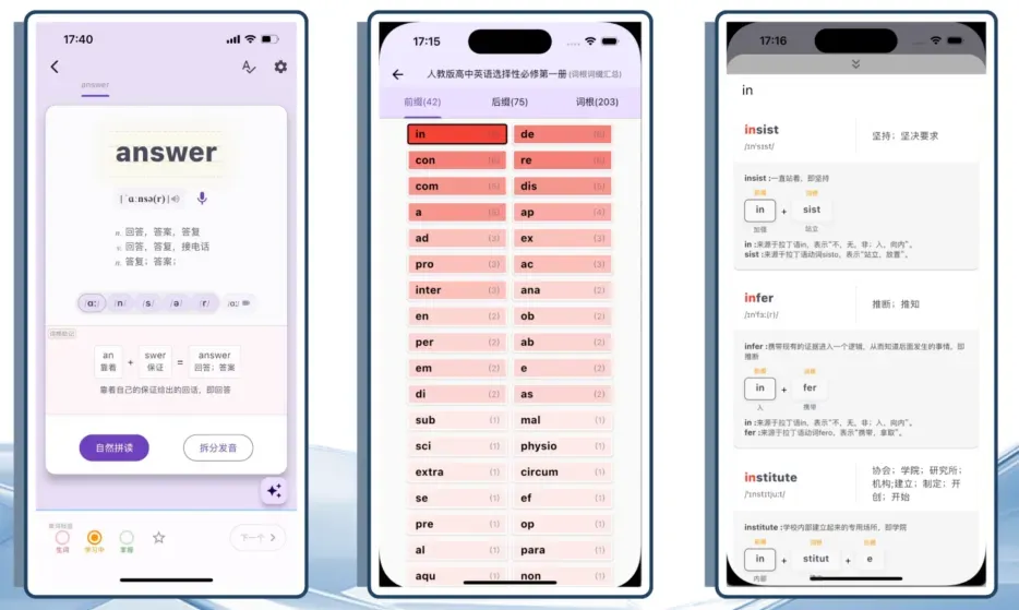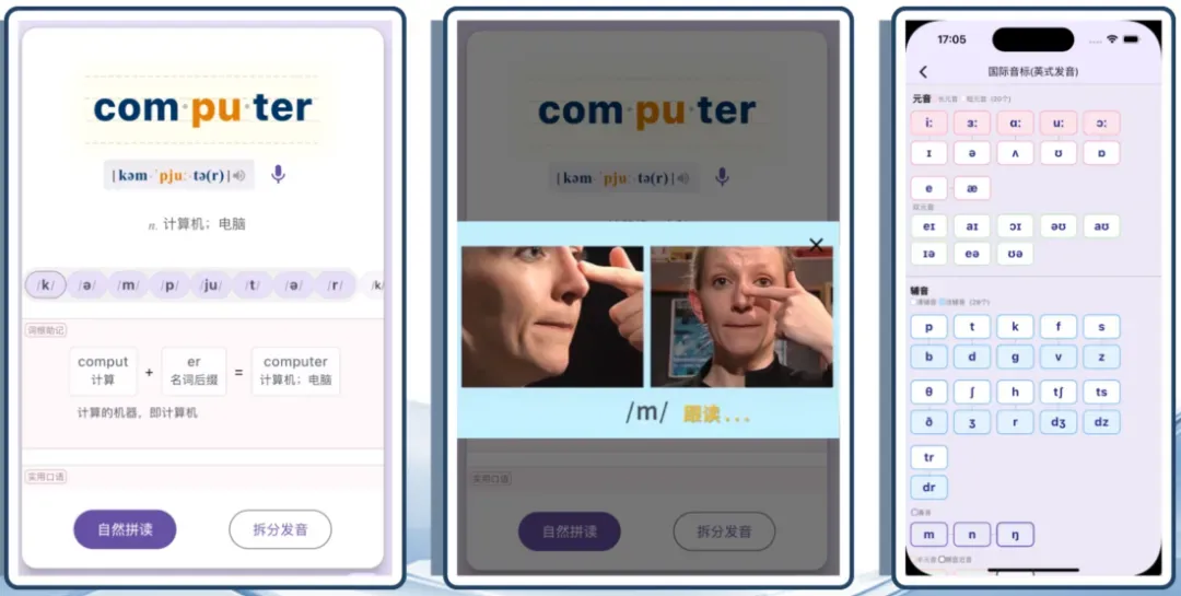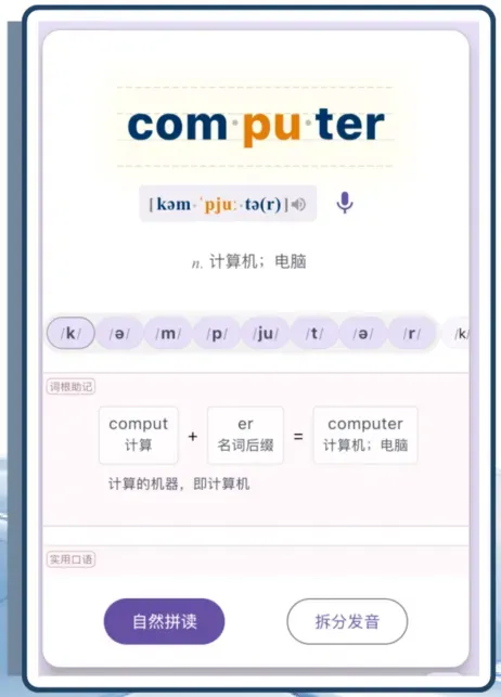 它用自然拼读、音节拆分、国际音标、词根词缀、实用口语等多种方式,让孩子有一个全方位熟悉学习单词的过程。