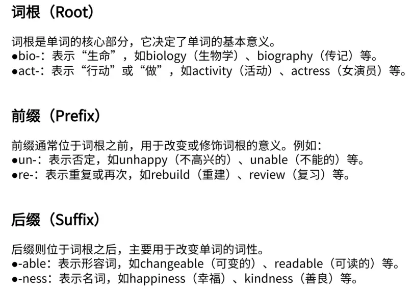 除了自然拼读和音节拆分,还有一个词根词缀的技巧,如果掌握词根词缀的规律,基本上就能推断出单词的基本意义,能帮孩子节省大量的记忆时间。