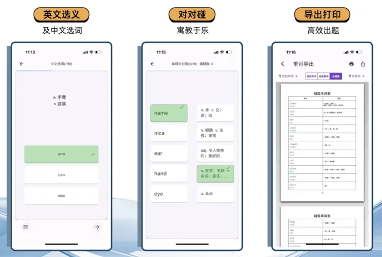 超级单词表还有教材单词导入的功能,特别适合学生党使用。此外还有不少实用的功能模块,比如可以选择播放次数和间隔的单词听写,发音评测,子朗读评测,寓教于乐的单词对对碰、语法分析、自然拼读教学、单词考题导出打印等等。