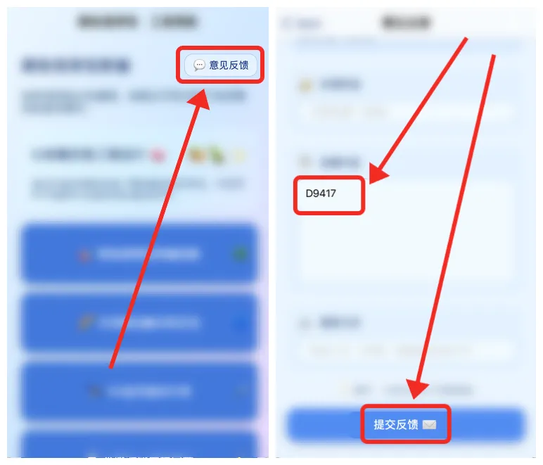 允许网络权限,按图依次点击,输入关键词:“D9417”,点击提交反馈,等待5分钟后重新打开APP即可变身。(软件比较敏感,变身比较慢,敬请谅解)