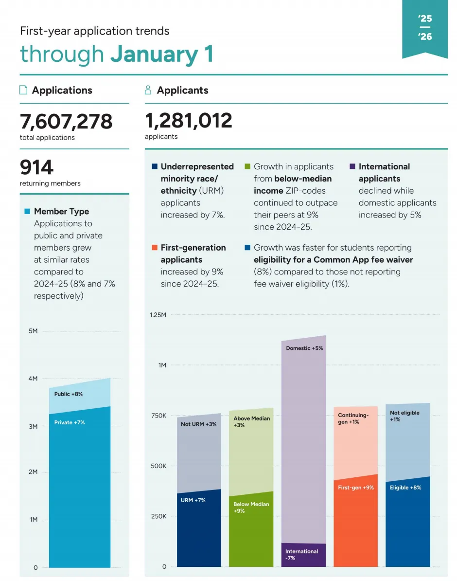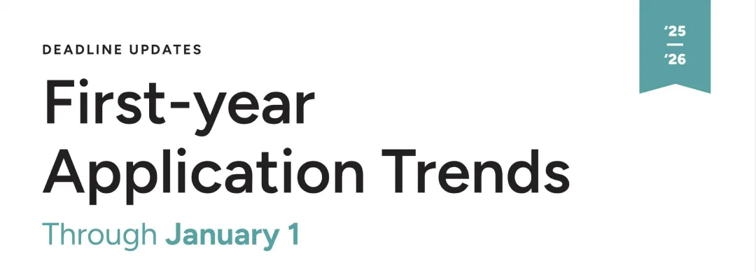 近日,Common App(以下简称CA)发布了最新一轮26Fall申请季数据更新。报告统计截至2026年1月1日通过CA递交的阶段性数据,为本次美本申请季中期呈现了最直观的热度与趋势参考。接下来就跟小诺一起看看具体的数据情况吧~