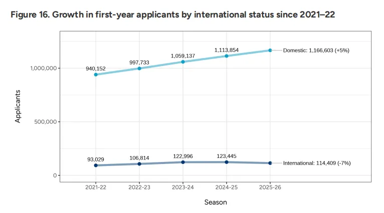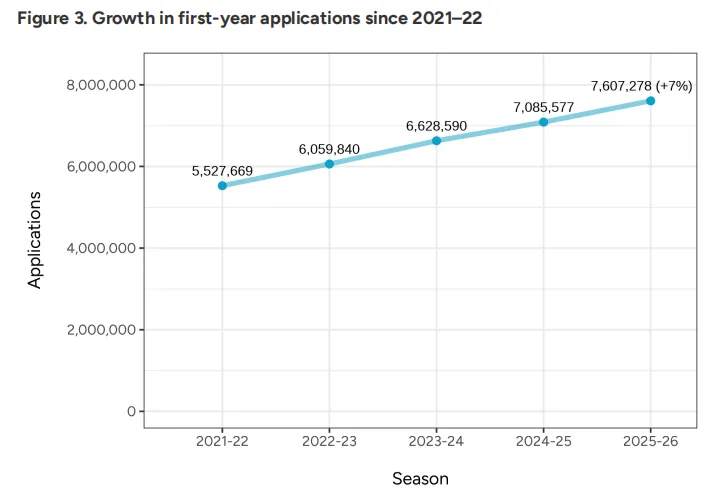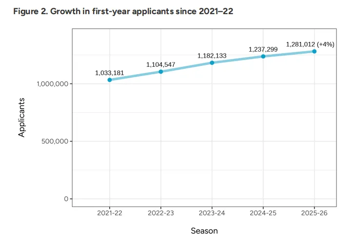 根据CA统计,截至2026年1月1日,在2025-26申请季共有1,281,012名学生通过Common App提交了7,607,278份新生申请。与去年同期相比,申请人数增加4%,申请总量增长7%。相较11月1日的数据,增速略有放缓,但整体仍保持上行趋势。