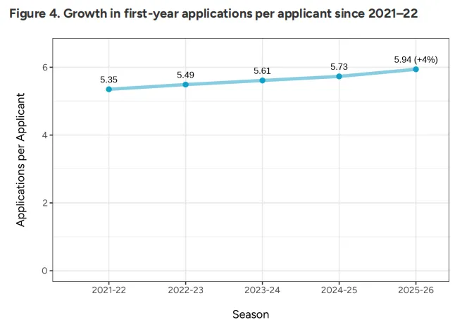 ⭐️人均申请大学数量:比2024-2025年略有增加,从平均每人申请5.73所院校,增加到了5.94所,涨幅4%。