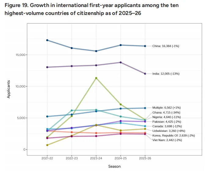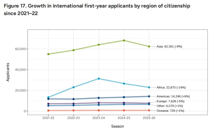 2025-26申请季,国际生共114,409人提交申请,较去年下降7%。同比美国本土增速(+5%)小了很多。虽然是整体下降了一点,但从国际申请者的地区分布来看,亚洲学生依然是申请的”主力军”,有62351人,占国际生生源总量的54%。非洲申请者降幅最大,为14%。欧洲申请者下降5%。