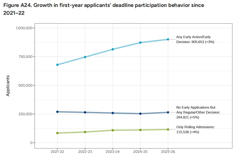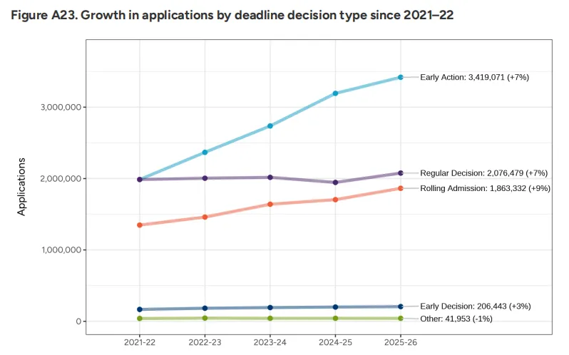 本轮申请季,早申人数达90万,上涨3%,其中EA(3,419,071份)数量上涨明显,申请量激增7%,ED(206,443份)同步上涨3%,常规轮(RD)申请人数(264,821人)同步上涨5%。早申仍是众多学生的首选。越来越多的美本申请者认识到了早申的优势与重要性,并且在院校的选择上更加多元化、注重风险分散。